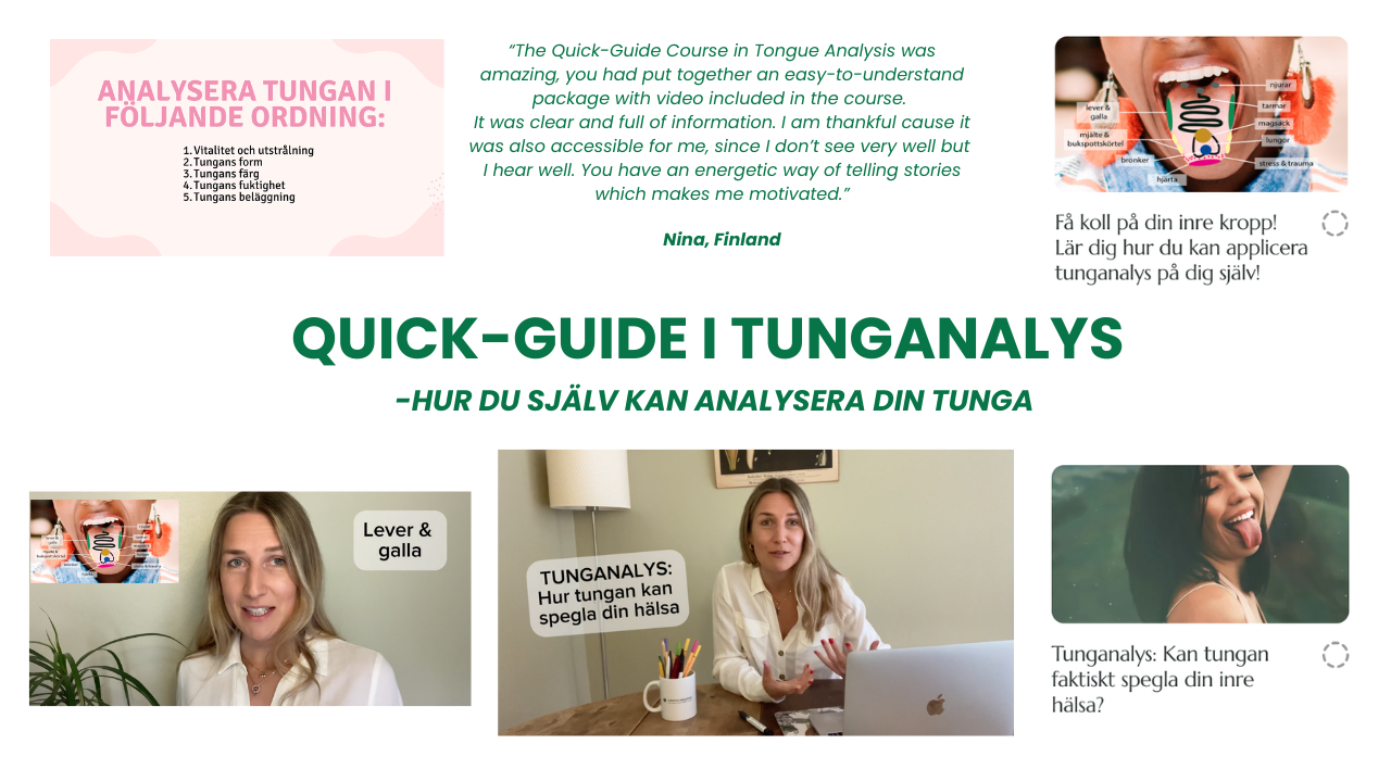 Välkommen till QUICK-GUIDE i hur du SJÄLV kan analysera din tunga! För 59 € får du delta i en flexibel och spännande kurs genom att registrera dig. Vad berättar tungan om din egen kropp och nuvarande hälsostatus? I denna kurs finns video-material, en skriftlig guide och workbook så att du kan lära dig mer om din egen kropp och hälsa! Du kommer få insikt i principer från kinesisk medicin, ett väldigt spännande synsätt som ser människan som en helhet! Ta del av en ny värld!